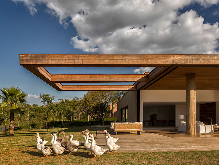 One hour away from Sao Paulo, this sustainable house in Itu is a weekend retreat for a young couple and their daughters. A prime position on the banks of a small lake and the presence of a large Tabebuia tree guided this project that aims to fusion with the landscape.