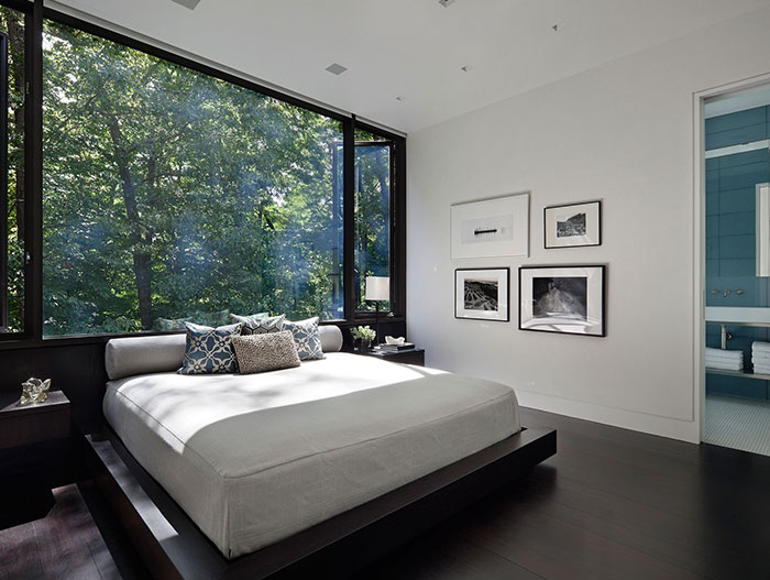New Canaan Residence is built on a steep grade, with the entry on the second level, so as you move inside, the feeling of grounded horizontality becomes one of floating in the treetops.