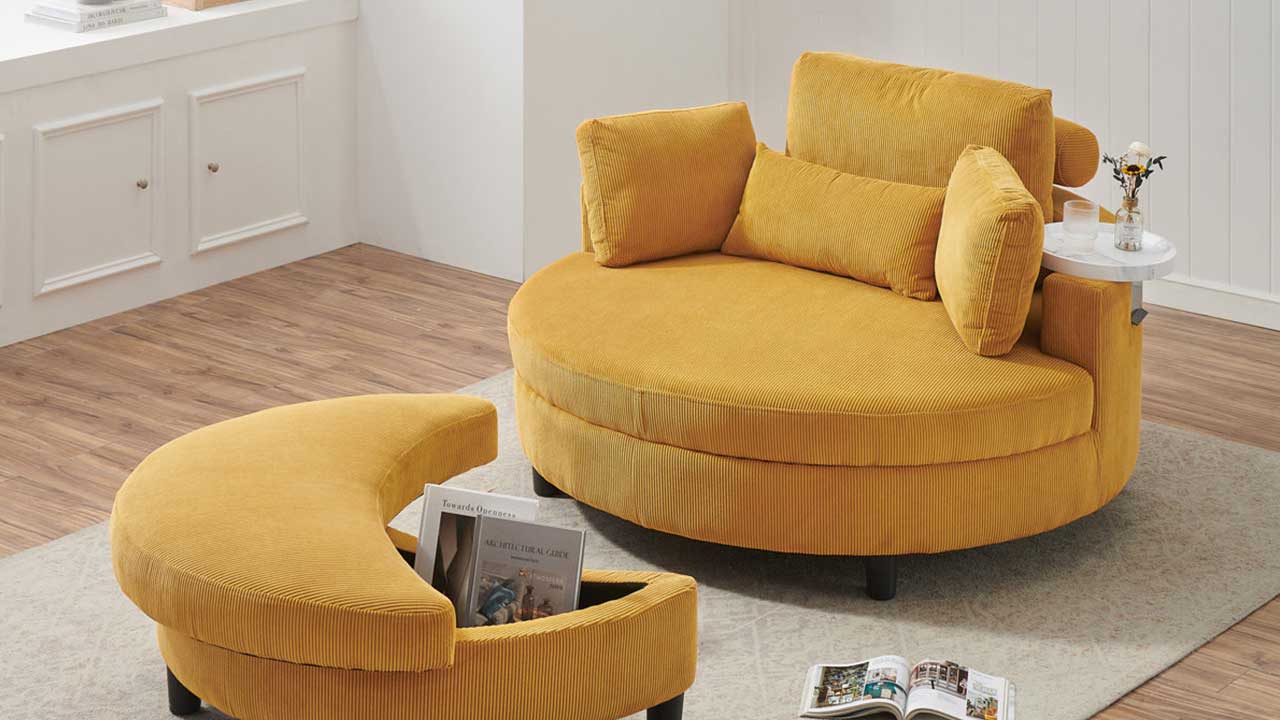Our final pick is this cozy corduroy armchair with ottoman. This chair combines a luxurious, textured feel with a sleek, contemporary curved design. The swivel base provides flexible and smooth movement, while the high-resiliency foam cushions ensure lasting comfort and support. Paired with the crescent moon ottoman, which functions as both a stylish footrest and additional seating, this swivel chair offers the perfect balance of chic design and cozy relaxation. It measures 41'' W x 34.25'' H x 34'' D and is available in Beige and Gray colors.