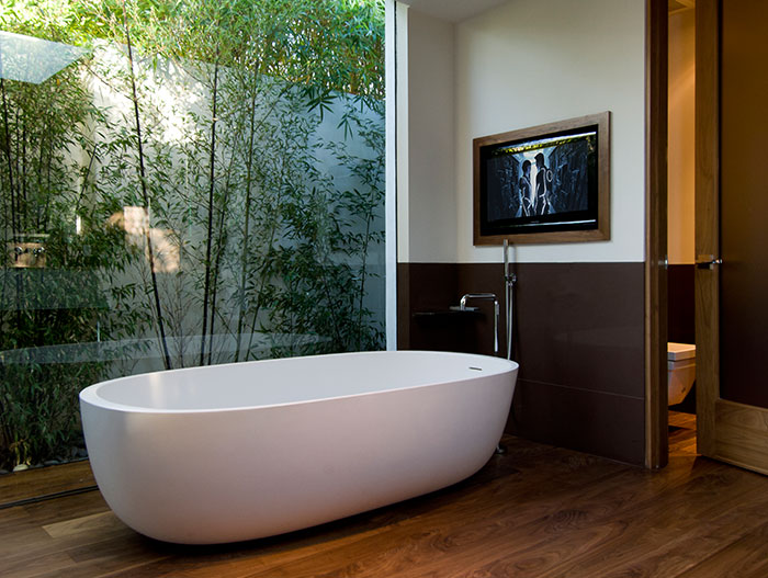 To complement the contemporary design, some technological features are used to keep the house up to date: i-pod docks in all rooms, integrated CCTV and alarm system, exterior speakers or the home theatre's professional 3DLP HD projector.