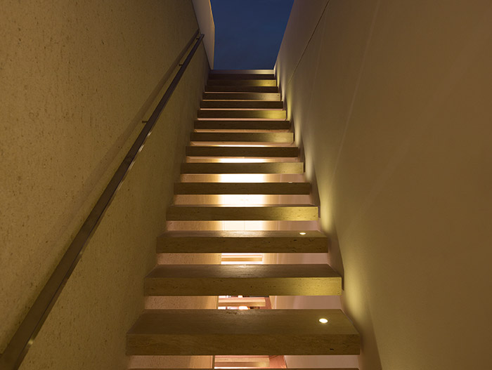 Overlooking the wooden volume that houses the washroom, stairs and dining room, is a “de dentro para dentro” esplanade, which is essentially an indoor balcony.