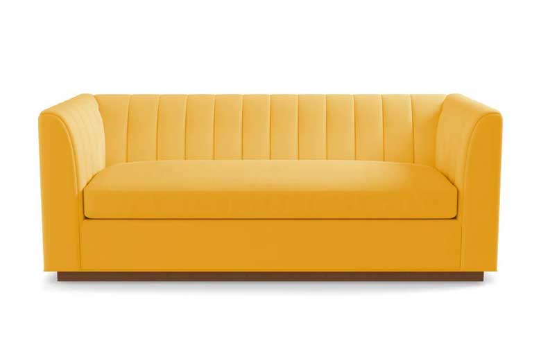 This modern yellow sofa adds style to any room. It measures 80.31'' W x 33.85''' H x 32.48'' D and features a clean-lined silhouette with chenille upholstery and tapered legs. Its foam-filled cushions provide support for moments of relaxation. This sofa is easy to assemble and comes in six colors: Beige, Blue, Green, Orange, Silver Gray and Yellow.